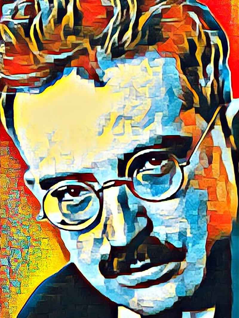 Notte, ero in un teatro vuoto. Vuoto… silenzioso, un teatro che non conoscevo, sembrava antico e nuovissimo. Le poltrone erano di legno grezzo, le quinte erano fatte di stoffa rossa che pareva fuoco. Dal soffitto pendevano lampade. Mi siedo sul bordo del palco, guardo la platea deserta, come una bocca spalancata. E allora lo sento. Un fruscio alle mie spalle, non ho paura. non fa paura, poi dei passi piccolissimi, come se sotto il palco si muovesse un esercito di formiche… o di bambini. Mi volto. Una luce. Una luce teatrale. Un taglio di quinta, netto, verticale. Appare dal fondo un uomo. L’uomo si ferma al centro del palcoscenico, si siede come chi aspetta da sempre, indossa un cappotto polveroso, un cappello scuro, una cartella di cuoio, occhiali tondi, sguardo da bambino e antico insieme, lo sguardo di chi ha visto più mondi di quanti ne possa raccontare. Lo riconosco …